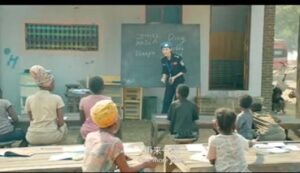 Kuva 2. Kiinalainen poliisi pitää oppituntia paikallisille lapsille fiktiivisessä ”Santa Leonnen” valtiossa elokuvassa Formed Police Unit, kuva YouTubesta.