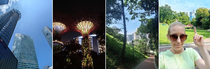 Blogitekstin pääkuva: Kuva 1. Singaporen kaupunkikuvaa hallitsevat pilvenpiirtäjät. Kuva 2. Konferenssi-illallinen järjestettiin turistien tuntemassa Gardens by the Bay -puutarhassa. Kuvat 3 ja 4. Kaupungin vehreissä puistoissa kelpaa konferenssituristin lenkkeillä. Kaikki kasvillisuus Singaporessa on jälkikäteen istutettua. Kuvat ottanut: Nuppu Pelevina.