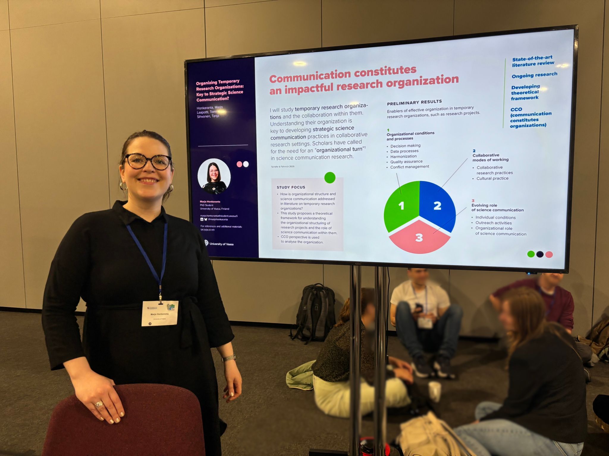 Oma esitykseni oli digitaalinen posteri tutkimushankkeiden organisoitumisesta ja sen yhteyksistä tiedeviestintään. Esitykseni rakentui kahden näkökulman varaan: ensin nostin alustavia tuloksia tekeillä olevasta kirjallisuuskatsauksestani ja sitten kerroin käytännön esimerkkejä ja hyviä käytäntöjä strategisen tutkimuksen DEMOGRAPHY-ohjelman viestintä- ja vuorovaikutustiimin työstä, jossa olen mukana.