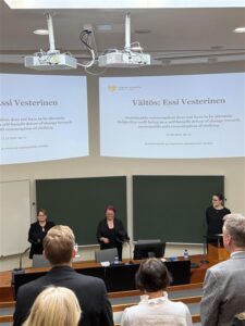 Perjantaina 17.10.2025 pääsin seuraamaan elämäni ensimmäistä väitöstilaisuutta, kun Essi Vesterinen väitteli tohtoriksi ja puolusti väitöskirjaansa ”Sustainable consuption does not have to be altruistic – Subjective well-being as a self-benefit driver for change towards sustainable anti-consuption of clothing”. Vesterisen väitöstutkimus kääntää päälaelleen pikamuodin ja jatkuvan markkinointivyöryn luoman mielikuva, että onnellisuus löytyy uusista ostoksista, ja määrittelee kestävän vaatekulutuksen uudelleen: se on ennen kaikkea ostamisen vähentämistä, käytön pidentämistä sekä poisheittämisen vähentämistä, ja tämä hidastaa koko kulutussykliä. Tilaisuuteen lähdin odottavaisin ja innostunein fiiliksin, enkä oikein tiennyt minkälainen tilaisuus tulisi olemaan. Mielikuvana oli ehkä hyvin virallinen, vähän ”jäykkä” mutta arvokas tilaisuus. Olettamukseni osui osittain oikeaan, mutta ei kuitenkaan ollut täysin sitä mitä ajattelin.